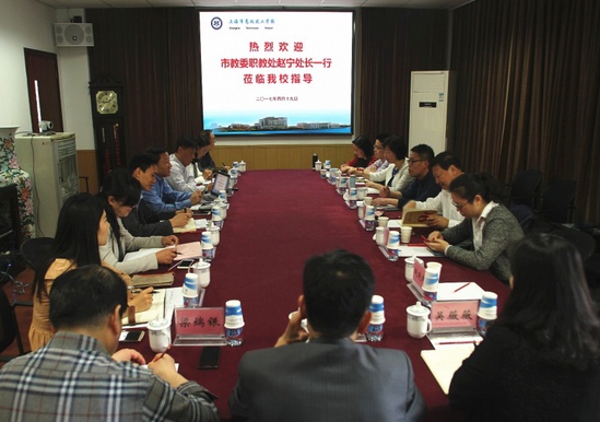 4月19日上午,上海市教委职业教育处赵宁处长、市教育技术装备中心书记周齐佩一行赴高职学院进行专程调研,参加调研的还有市教委职教处张福顺副处长、黄蕾、马骏、潘波、赵晓伟老师。高职学院胡宁院长,副院长郑卫、万军,三系一部主任及各职能部门的负责人参加了调研。