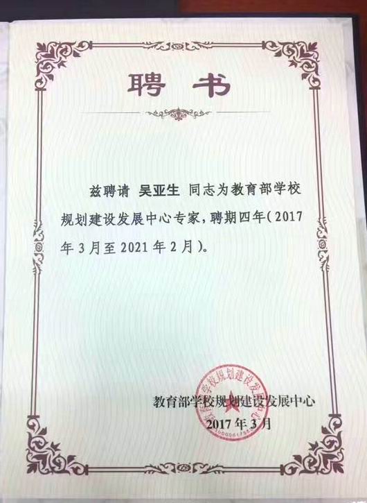 教育部学校规划建设发展中心是经中央机构编制委员会办公室批准设立的教育部直属事业单位,以为全国学校规划建设发展提供服务为宗旨。本次吴亚生教授被聘为中心专家,体现了教育部学校规划建设发展中心对我校师资实力和研究成果的认可,是一项难得的荣誉。吴亚生教授表示,将在未来的四年中,为教育部学校规划建设发展中心的决策提供民意和科学的依据,为中国教育事业的发展贡献力量。