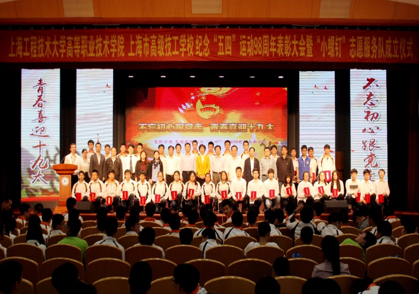 5月4日下午,高职学院在师生活动中心涵景堂举行“不忘初心跟党走、青春喜迎十九大”纪念“五四”运动98周年表彰大会暨“小螺钉”志愿服务队成立仪式。学院党委沈海庆书记,学院院长胡宁,学院党委副书记田盈耕、段海霞,副院长郑卫出席。中共四大纪念馆邹悦副馆长、左翼作家联盟纪念馆吕俊书记、上海铁路局上海站团委陈浩书记等志愿者合作基地嘉宾受邀参加,学院系部领导、相关科室负责人、教师代表、团员青年代表出席本次会议。大会由段海霞副书记主持。