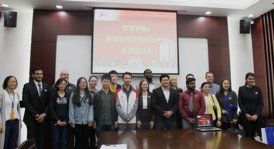 为提高学生国际化水平,拓宽国际视野,5月9日下午,管理学院在图文信息中心第五报告厅与美国圣克劳德州立大学师生进行了座谈交流。管理学院谢研曦老师、刘佼老师,学校国际交流处石新志老师,及管理学院的研究生代表们出席了座谈会,会议由管理学院谢研曦老师主持。