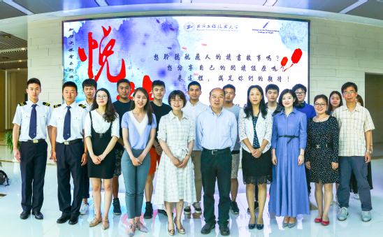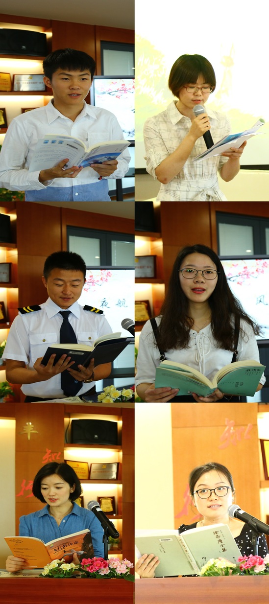 第一位朗读者,是来自2015级航空物流管理的叶淑婕同学。她朗读了埃克苏佩里的《风沙星辰》。她表示,这本书里描绘的无畏而勇敢的精神让她印象深刻。飞行技术系的李佩绮老师和2015级飞行学员戚以诺为我们演绎了经典英文原著《小王子》中的对话。这对师生的对话朗读如同行云流水般自然,让我们充分感受到英文的美。 2015级飞行学员张一博同学选读了柏瑞尔•马卡姆的《夜航西飞》。他用温雅磁性,松弛有度地朗读,让我们仿佛看到非洲的星辰、沉默的草原、远方的风声,也感受到了作者对飞行的热爱。民航运输系的赵鸣老师与我们分享了她的读书格言:“读书足以博彩,足以怡情,足以长才”。赵鸣老师的朗读声抑扬顿挫,情感奔涌如飞,恰到好处地将徐志摩的《想飞》中对理想的执着追求展现的淋漓尽致,听着这篇朗读,仿佛进入一次灵性之超尘脱俗的飞翔之中。来自2016级航空器械维修专业的孙竟耀同学选择的是环球航行家陈玮的《云上八万里》。孙竟耀同学用他充满力量地声音大声朗读“我决定守护我的梦想,不让别人偷走他。”学生工作办公室赵梦影老师坚持始终如一的阅读习惯,读书之于她是再平常不过的事。她认为“文学即人学”,透过书她可以看到更广阔的人心。她为我们朗读的书是《飞行的诗意》。在她优美的朗读声中,尘世好像被我们远远地抛在身后,我们似乎忘记了飞行是需要很多的辛劳和汗水,却只能感受到飞行是一件充满诗意的事情。
